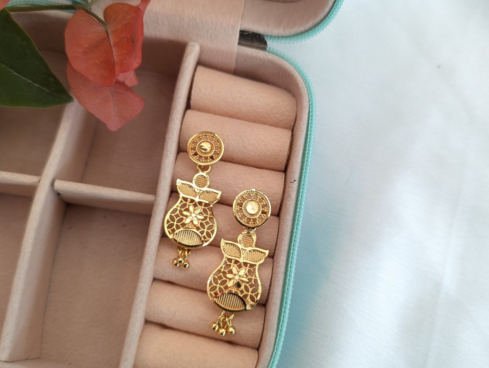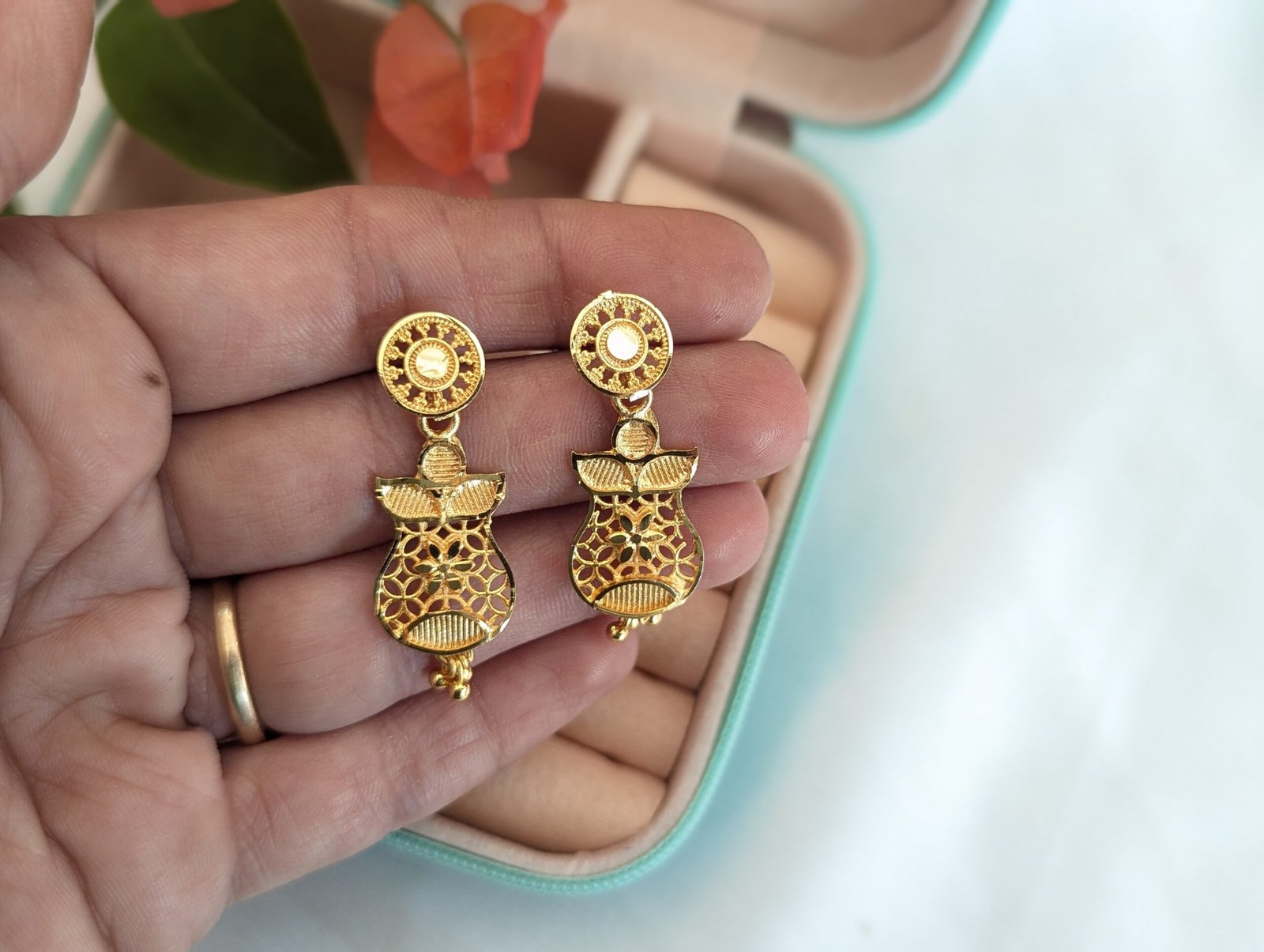Grace your style with the exquisite Apsara Earrings. Made from durable copper and adorned with a 1 gram gold polish, these earrings bring a radiant and sophisticated touch to any outfit. Ideal for both casual and festive occasions.