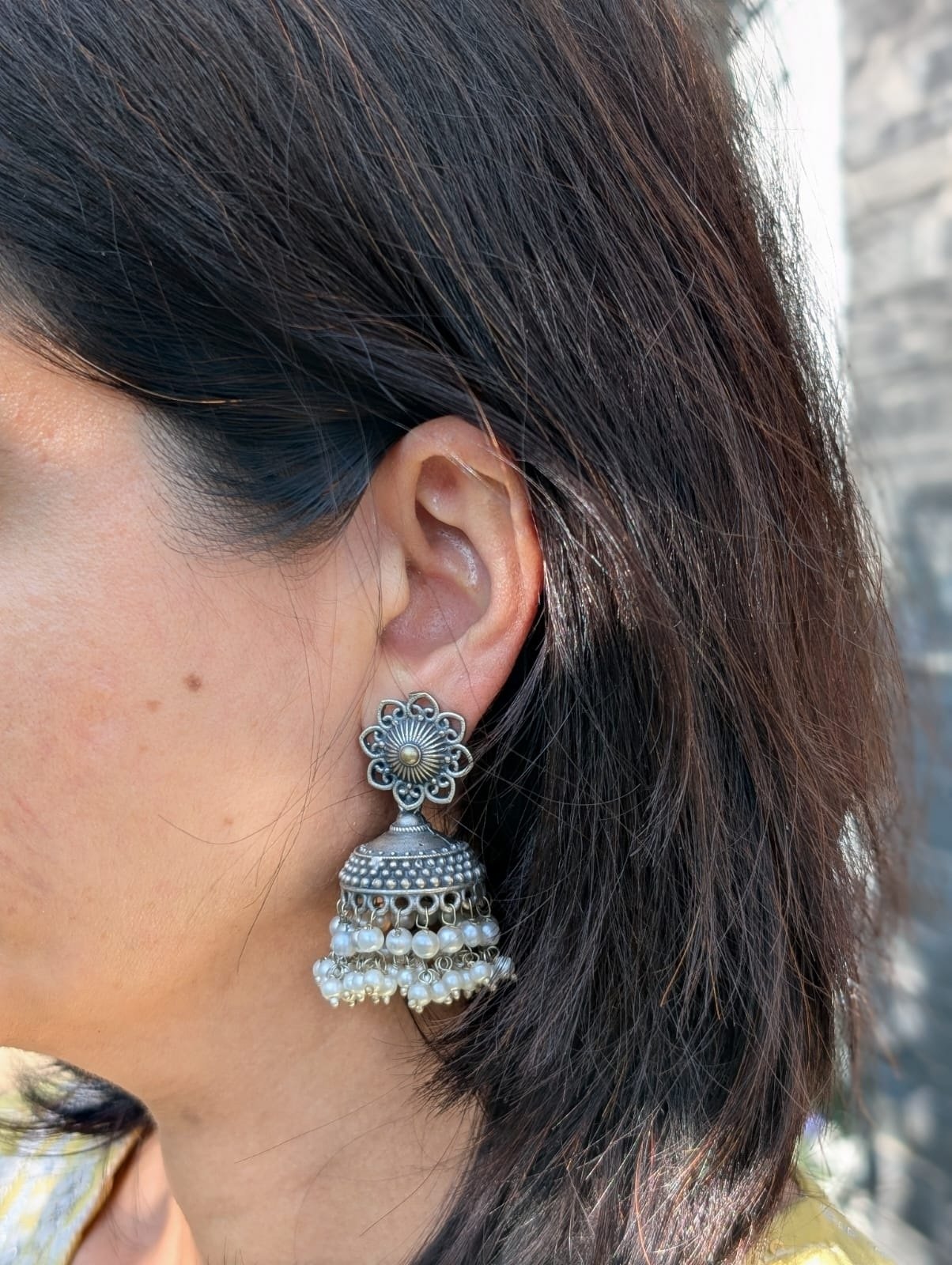 Devika Jhumka embodies divine elegance with its classic brass form and graceful pearl hangings. Inspired by timeless temple jewelry, this piece adds a touch of sacred charm and refined beauty—perfect for festive occasions and traditional ensembles. ✨