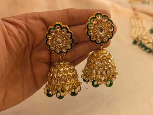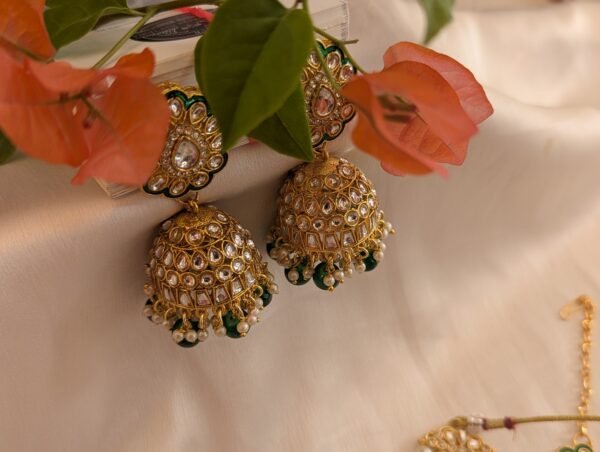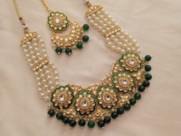 Elevate your festive look with our exquisite Green Jodha-Style Necklace Set with Maangtika. Inspired by royal Mughal elegance, this stunning set features intricate craftsmanship with traditional Kundan work, vibrant green stones, and antique gold detailing. The set includes a statement necklace, matching earrings, and a beautifully coordinated maangtika — perfect for weddings, sangeets, or any celebratory occasion. Add timeless grace to your ensemble with this regal jewelry set that radiates heritage charm and festive grandeur.
