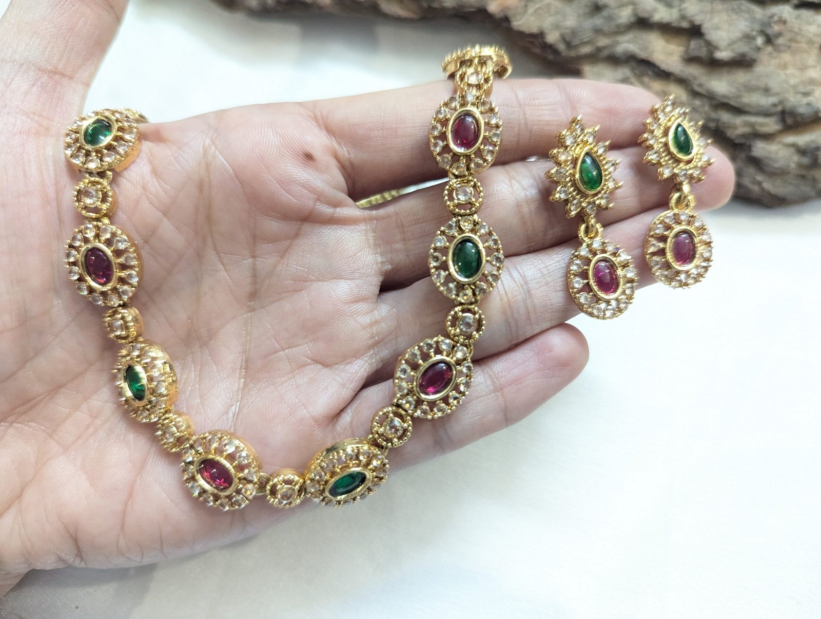 Celebrate tradition with this exquisite ethnic jewelry set. Crafted from brass and gold plated, it features stunning Kemp stones that add a vibrant touch. The set includes one elegant necklace and a matching pair of earrings, perfect for festive and special occasions.