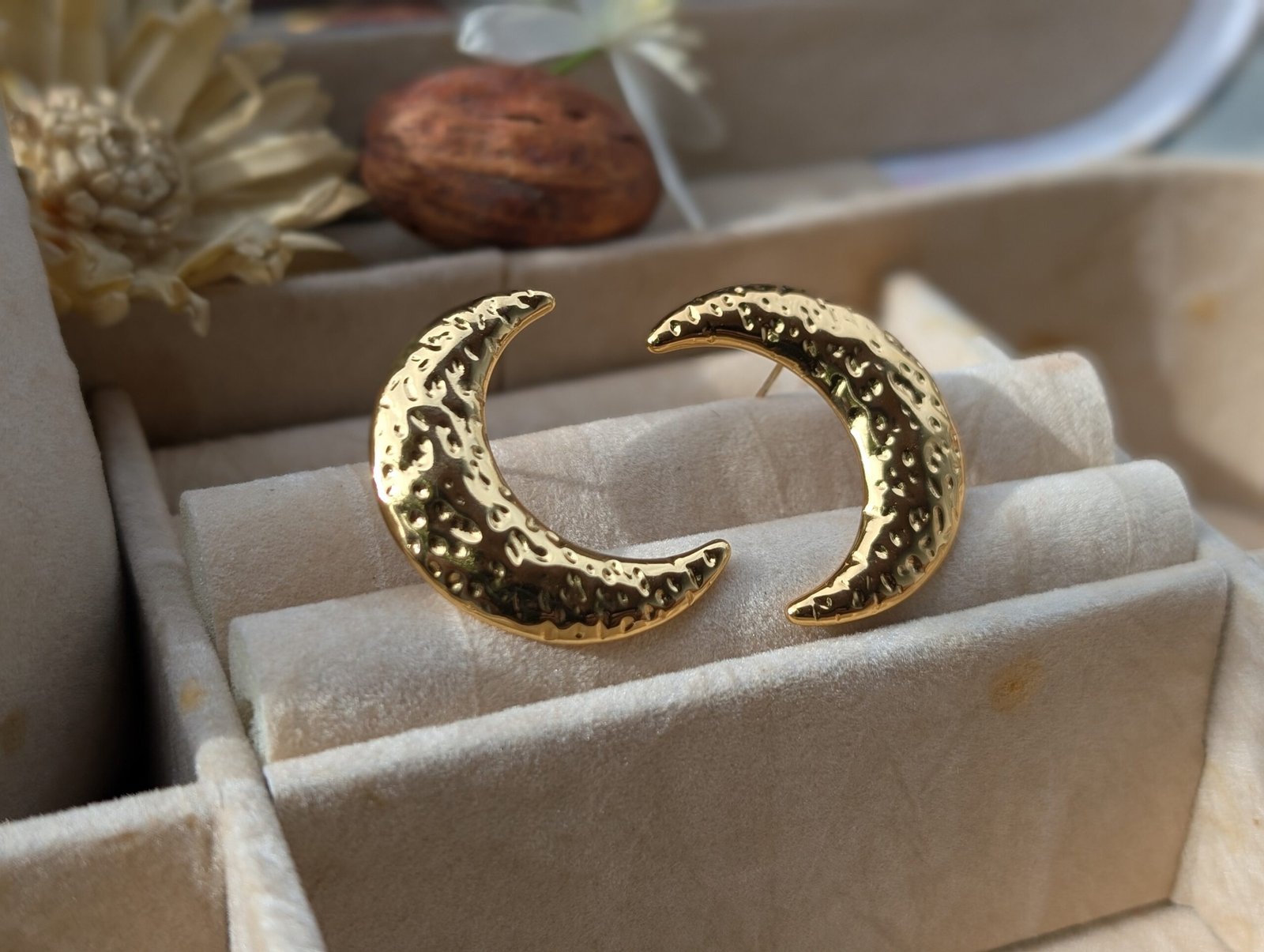 Sleek and celestial, the Moondra Earrings are crafted from high-quality stainless steel with a radiant gold polish. Their anti-tarnish finish ensures lasting shine, making them a standout piece for both everyday wear and special occasions.