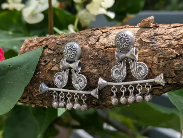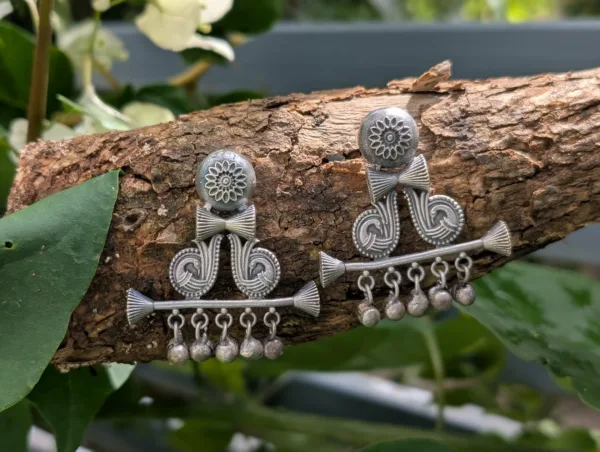 Inspired by nature, the Morika Earrings feature a graceful silver replica design with intricate peacock motifs. Their silver finish and artistic detailing make them a perfect choice for adding a touch of heritage charm to any ensemble.