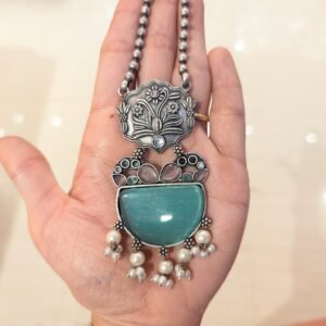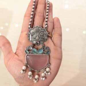 Grace meets tradition with the Sandhya Long Necklace Set. Designed to resemble timeless silver look a like jewellery, this intricately crafted set features a beautifully detailed long necklace paired with matching earrings. Perfect for festive occasions, weddings, or adding a touch of heritage to your modern wardrobe. Shine in silver, without the weight or price.