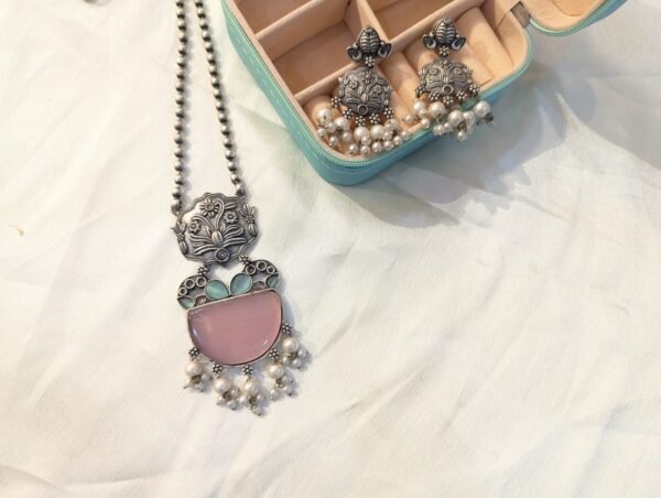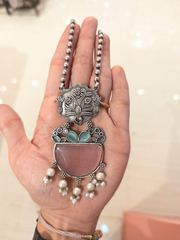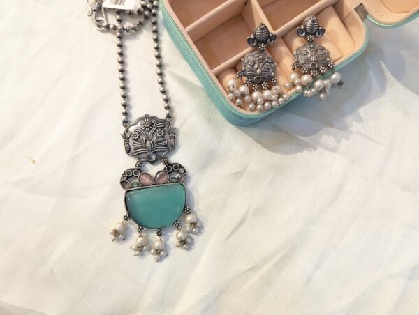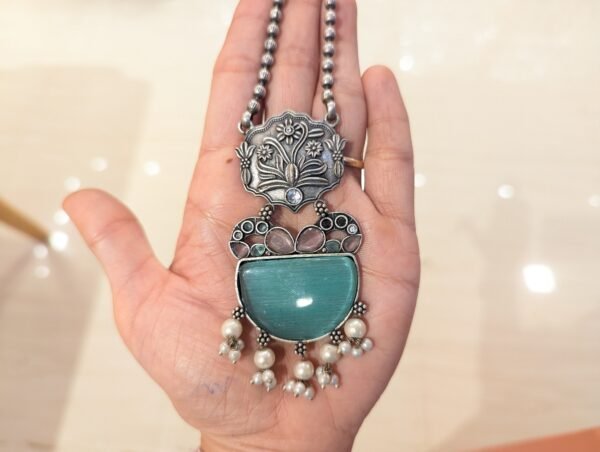 Grace meets tradition with the Sandhya Long Necklace Set. Designed to resemble timeless silver look a like jewellery, this intricately crafted set features a beautifully detailed long necklace paired with matching earrings. Perfect for festive occasions, weddings, or adding a touch of heritage to your modern wardrobe. Shine in silver, without the weight or price.