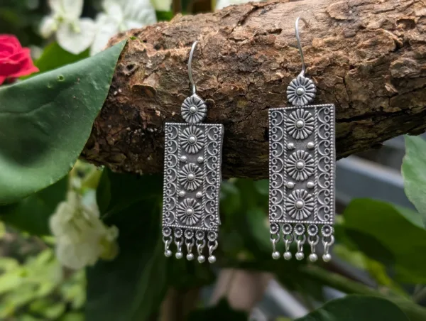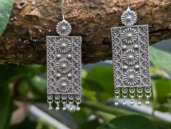 The Sutra Earrings feature a classic silver replica design with intricate thread-inspired patterns and a subtle silver finish, making them a versatile accessory for both traditional and contemporary styles.